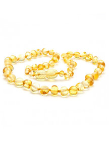 Up to and including the age of three, you can easily choose the baby necklace with a length of 28/32 cm. Is your child older? Then go for the amber children's necklace of 38 cm. However, the length remains a personal choice because it is also a matter of taste. To see what length you like, you can cut a string on the length and fit it. Note: By wearing the amber jewellery, the buttons between the beads can be pulled a bit tighter, which also makes the necklace or bracelet a little bigger.