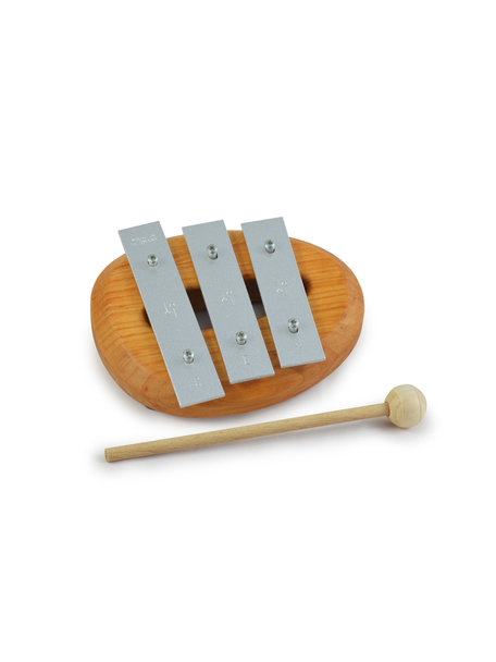 Beautiful handmade wooden pentatonic glockenspiel with tones C3, E3 and G3. The brass plates are placed on small strips made of felt, so that they can vibrate freely and a beautiful, lasting sound is created. These triads are particularly suitable for children's first experience with musical tones. If all three sound bars are struck simultaneously (or directly after each other), a beautiful triad sounds. This glockenspiel comes with a soft wooden mallet.