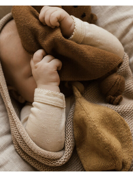 Hvid Titi comforter, ochre. This Titi pacifier holder is the perfect comforter for your little one. Made out of 100% merino wool, it gives your little one comfort and trust. Merino wool doesn't itch and is antibacterial and therefore perfect for kids with eczema or sensitive skins.