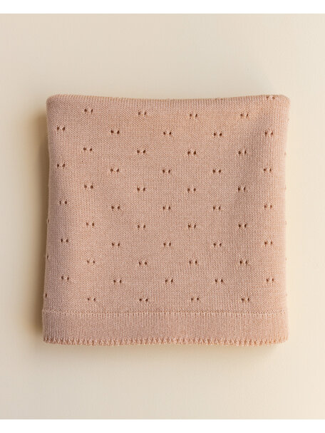 Hvid baby blanket Bibi, in colour oat. This blanket is made of extra fine merino wool and wonderfully soft. A blanket with a lovely openwork pattern. The thickness makes it suitable for all seasons.